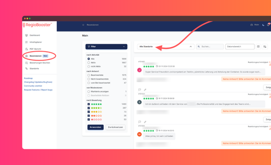 Google hat die Funktion zum Filtern der eingegangenen Bewertungen entfernt. Mit dem RegioBooster® kannst du weiterhin alle Bewertungen nach Aktualität und gegebenen Sternen filtern. Außerdem ist es möglich, ALLE Bewertungen zu sehen - auch die, welche nicht (mehr) bei Google angezeigt werden und somit "inaktiv" sind. Du siehst auch den Verlauf der Bewertungen und alle Änderungen.